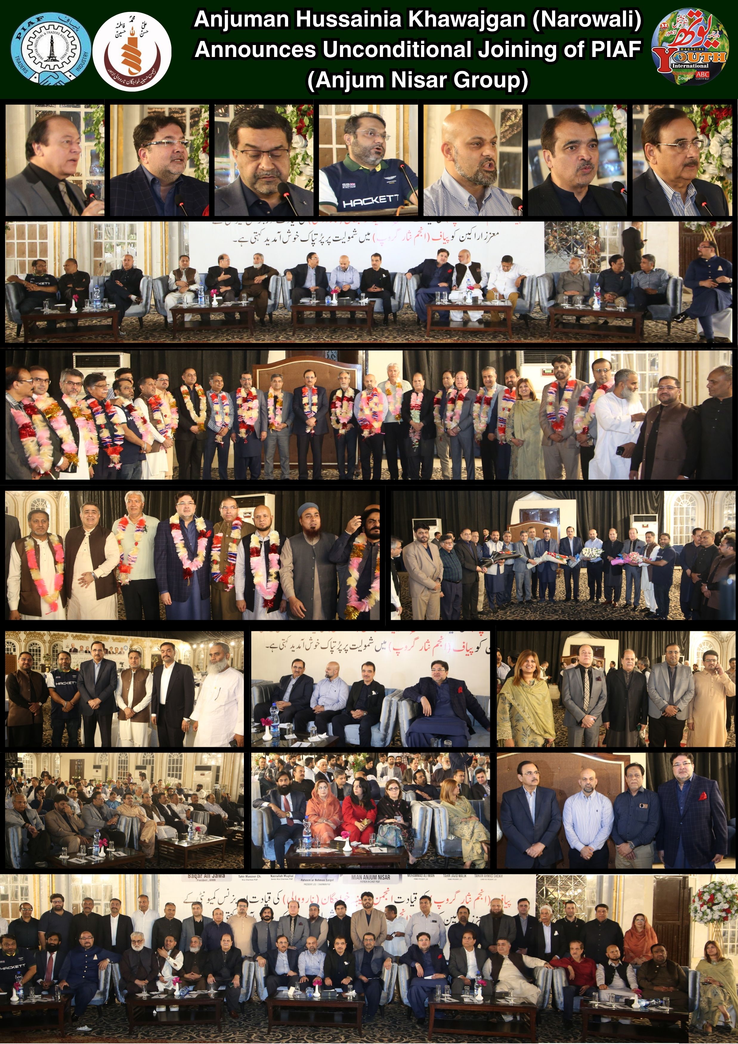 Anjuman Hussainia Khawajgan (Narowali) has announced its unconditional joining of PIAF (Anjum Nisar Group). In this regard, a dignified ceremony was held at a private hotel, where a 100-member delegation of the Anjuman, led by its President Baqir Ali Jawa, participated.The delegation met with PIAF Patron-in-Chief and SAARC Chamber Vice President Mian Anjum Nisar, Chairman PIAF and President Lahore Chamber Faheem ur Rehman Sehgal, along with other PIAF leaders.On the occasion, Anjuman Hussainia Khawajgan (Narowali) also announced its unconditional support for PIAF (Anjum Nisar Group) in the upcoming Lahore Chamber elections.PIAF (Anjum Nisar Group) hosted a dinner in honor of the delegation, attended by prominent members of the business community, Lahore Chamber board members, and a large number of voters.During the ceremony, President Baqir Ali Jawa formally announced joining PIAF in the presence of a large gathering, which was warmly welcomed by the participants.The event was also attended by Senior Vice Chairman PIAF Nasrullah Mughal, Vice Chairman Tahir Manzoor, former Chairman Muhammad Ali Mian, Senior Vice President Lahore Chamber Tanveer Ahmed Sheikh, Khalid Pervaiz, and many other members of PIAF and the Lahore Chamber.At the conclusion of the ceremony, PIAF leadership reaffirmed their commitment to unity, progress, and collective efforts of the business community.