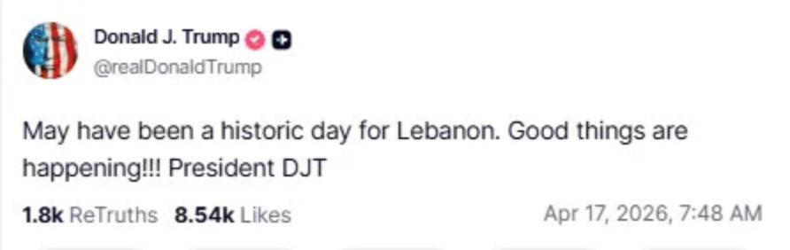 اپنی ثالثی میں طے پانے والی جنگ بندی کو مسلسل سراہتے ہوئے انہوں نے دن کی 29 ویں پوسٹ میں مزید کہا کہ شاید لبنان کے لیے یہ ایک تاریخی دن تھا، اچھی چیزیں ہو رہی ہیں۔واضح رہے کہ گزشتہ روز امریکی صدر ڈونلڈ ڈونلڈ ٹرمپ نے لبنان اور اسرائیل کے درمیان جنگ بندی کا اعلان کرتے ہوئے کہا کہ دونوں ممالک 10 روزہ سیز فائر پر متفق ہو گئے ہیں۔