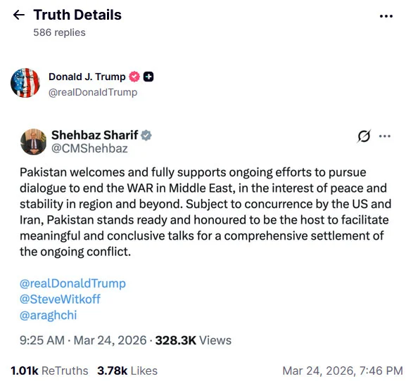 امریکی صدر ڈونلڈ ٹرمپ نے وزیراعظم شہباز شریف کا بیان اپنے سوشل میڈیا اکاؤنٹ پر شیئر کردیا ہے۔وزیراعظم شہباز شریف کا بیان امریکی صدر ٹرمپ نے ٹروتھ سوشل پر بغیر کسی کیپشن کے شیئر کیا ہے۔وزیراعظم نے سماجی رابطے کی ویب سائٹ پر جاری اپنے بیان میں کہا تھا کہ پاکستان جاری بحران کے خاتمے کےلیے بامقصد مذاکرات کی میزبانی کےلیے تیار ہے۔